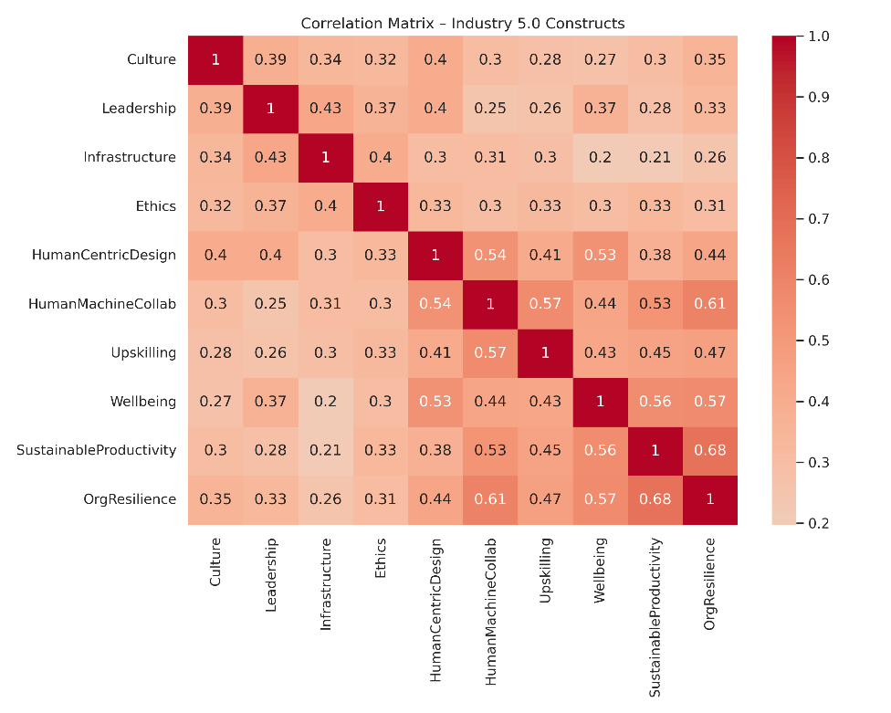 La Figura 1 presenta la matriz de correlaciones de Pearson entre los diez constructos del modelo. Las asociaciones observadas son predominantemente positivas y de magnitud baja a moderada, coherentes con el marco conceptual de Industria 5.0, donde las condiciones organizacionales influyen indirectamente sobre los resultados a través de procesos humanocéntricos.