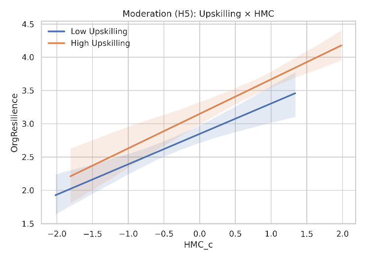 En relación con la resiliencia organizacional, los resultados muestran que tanto la colaboración humano–máquina como la capacitación (upskilling) tienen efectos directos positivos. Sin embargo, no se encuentra evidencia de un efecto moderador significativo de la capacitación sobre la relación entre colaboración humano–máquina y resiliencia. Este resultado sugiere que la capacitación actúa como un recurso organizacional independiente, cuya contribución a la resiliencia no depende necesariamente de su interacción con otros procesos tecnológicos.