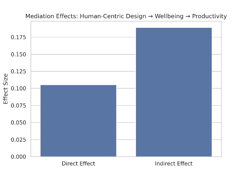 Se evidencia que el bienestar laboral constituye un mecanismo central en la generación de desempeño operativo sostenible. Los análisis muestran que el efecto del diseño humano-céntrico sobre la productividad se explica, en gran medida, de forma indirecta a través del bienestar, superando al efecto directo. Este hallazgo posiciona al bienestar laboral no solo como un resultado deseable, sino como un determinante estratégico del desempeño organizacional, integrando las dimensiones humana y económica en un mismo marco analítico.